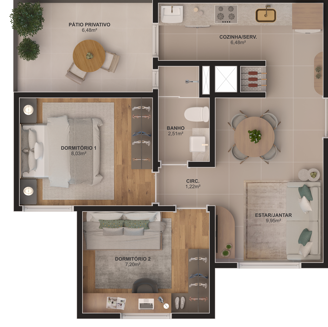 2 DORMITÓRIOS COM PÁTIO
